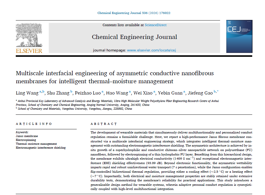 近日,化学化工学院汪玲博士以第一作者,安庆师范大学为第一单位在国际知名期刊《Chemical Engineering Journal》发表题为“Multiscale interfacial engineering of asymmetric conductive nanofibrous membranes for intelligent thermal–moisture management”的研究论文。该期刊为JCR 一区、中科院一区 TOP 期刊,影响因子13.2。