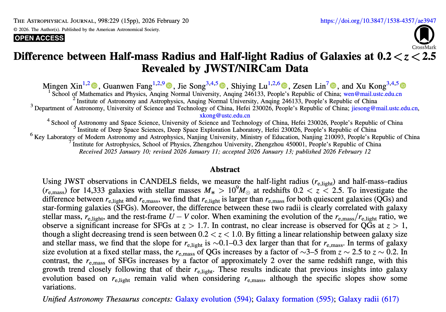 近日,物理学专业2023级邓稼先班本科生辛明恩同学以第一作者撰写的论文《Difference between half-mass radius and half-light radius of galaxies at 0.2<z<2.5 revealed by JWST/NIRCam data 》被SCI期刊《Astrophysical Jounral》正式发表。该期刊为天文学领域国际三大顶级期刊之一,其影响因子为IF=5.4,JCR一区,中科院二区。本论文是在物理与天文空间学院天文与天体物理研究所方官文研究员及陆诗莹博士的指导下完成,安庆师范大学为第一完成单位,方官文研究员为通讯作者。